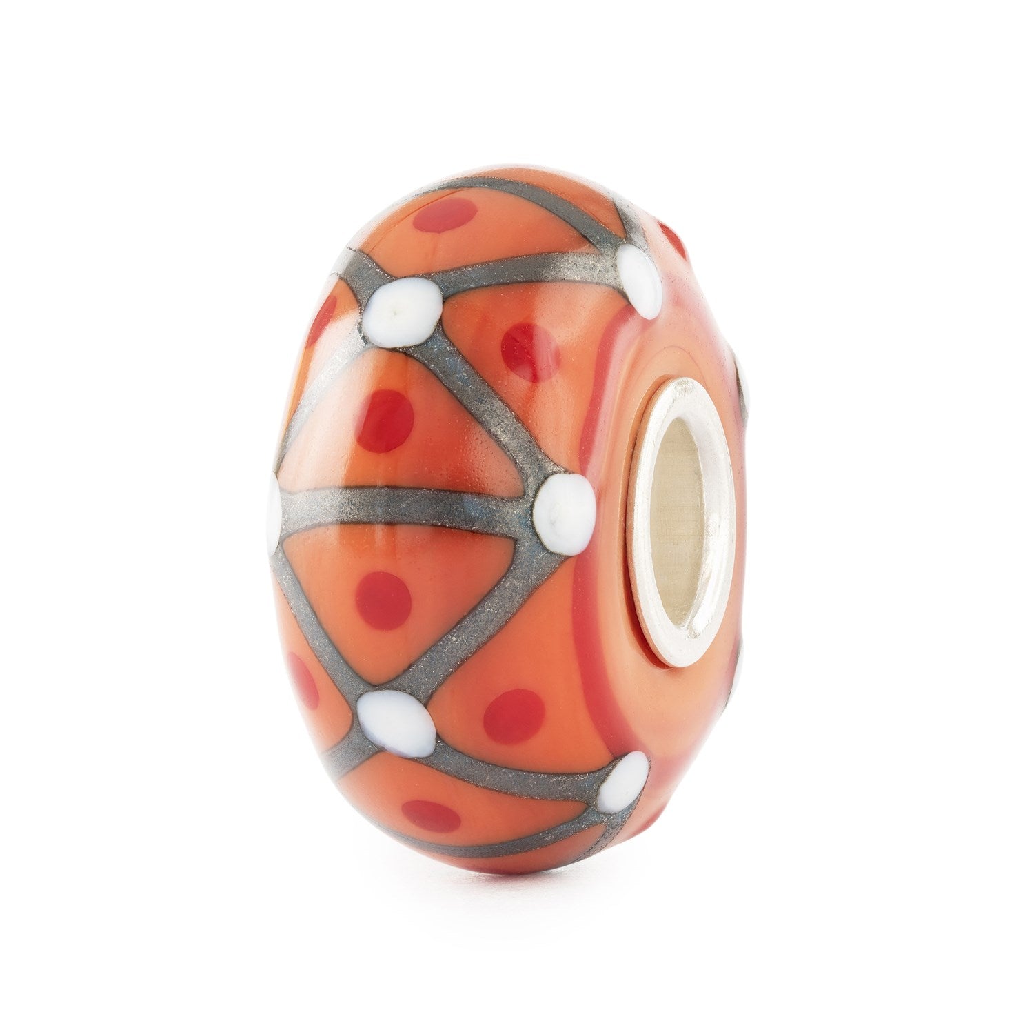 This glass bead has a classic shape and smooth surface, presenting incredible details. Red and white dots and silvery grey lines embellish this bead on a dark rusty-red backdrop. The bead has a clean and simple look, yet at the same time, being incredibly detailed. A sterling silver core adds a refined finish, making it as enduring as it is radiant.