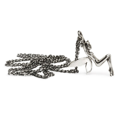 The oxidized Sterling silver chain is strung with the silver bead Joyful Flower on top of the two glass beads Trust and Romance. Holding the beads in place is the Silver Spacer Oxidized. At the end of the chain is a silver Elf attached.