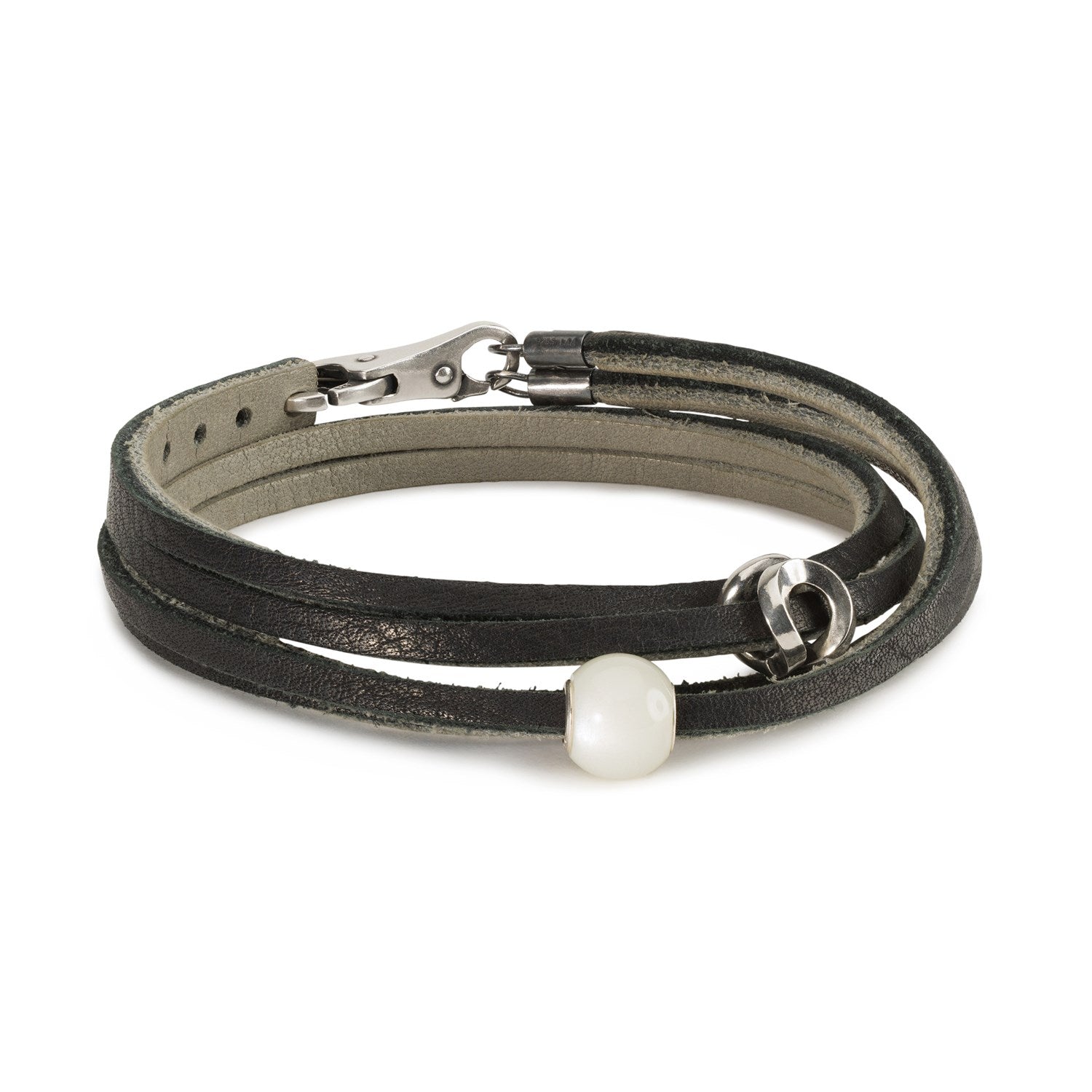 The silver Humble Knot is paired with the Round White Moonstone gemstone on the suple leather bracelet in Black/Grey facened with silver Plain Lock.